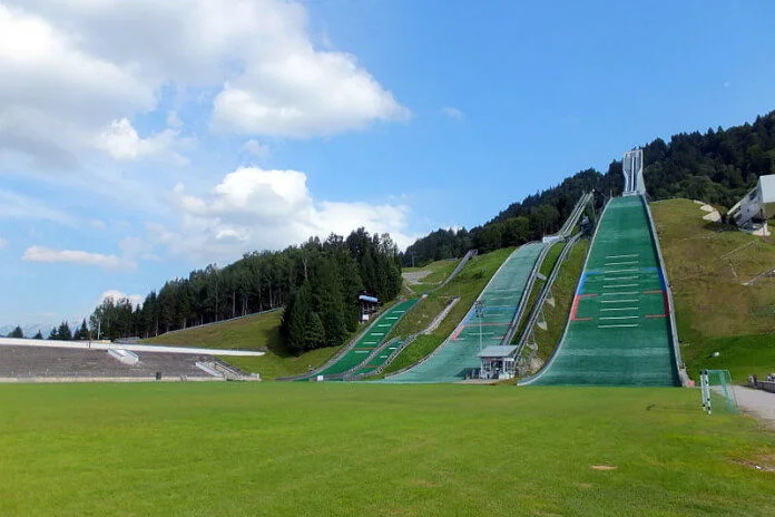 Naopak v top stavu jsou skokanské můstky. V roce 2007 byl postavený kompletně nový skokanský můstek se 100 metrů vysokou nájezdovou věží. Ta patří k architektonickým perlám Garmisch-Partenkirchenu a byla oceněná mnoha architektonickými cenami. Díky průsvitnému nátěru krásně zapadá do okolní zasněžené přírody. Nejpůsobivější je ale během zimních nocí, kdy bývá zevnitř nasvícená.