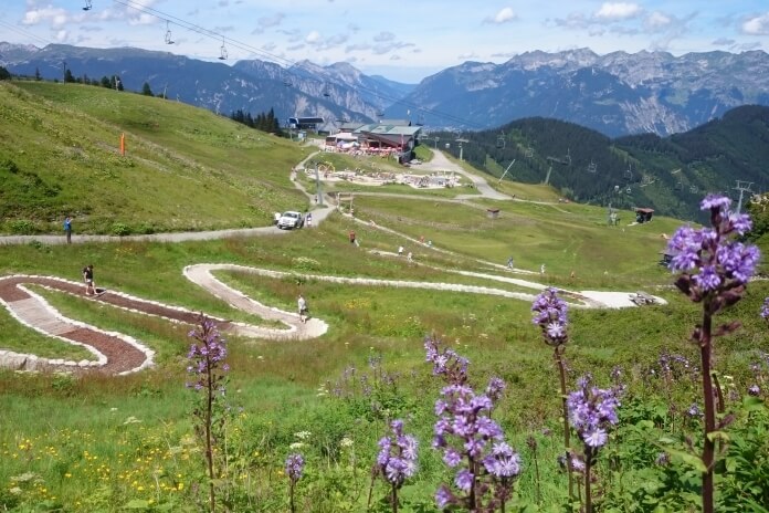 Zpátky do Fügenu nemusíte jet lanovkou, ale můžete sejít Spieljoch pěšky. Zvládnout by takový výlet měli i malé děti, osobně to máme vyzkoušeno se šestiletými turisty a cesta se jim opravdu líbila. Z horní stanice lanovky se prostě vydejte směrem na prostřední stanici Mittelstation Fügen. Tady se můžete občerstvit v Gasthof Kohleralmhof, restauraci s terasou a dětským hřištěm. A máte tady rovnou dvě možnosti, jak si výlet zkrátit, kdyby někomu došly síly. Můžete nastoupit na lanovku a sjet do údolí nebo počkat na autobus, který od Kohleralmhof do Fügenu odjíždí v 14:30, 15:30 a naposledy v 16:30.